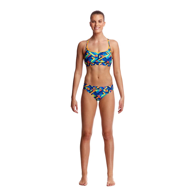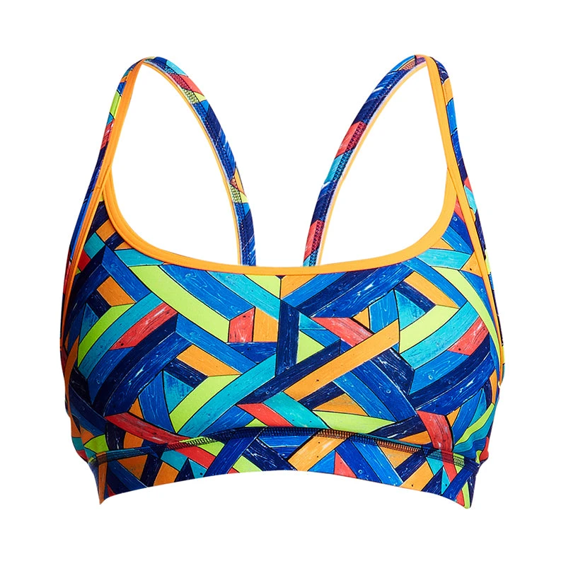 Firm fitting sports crop top with racer back and double strap bind finish with wide elastic for under bust support to give you the support you need in a sports top. Sold as separates.