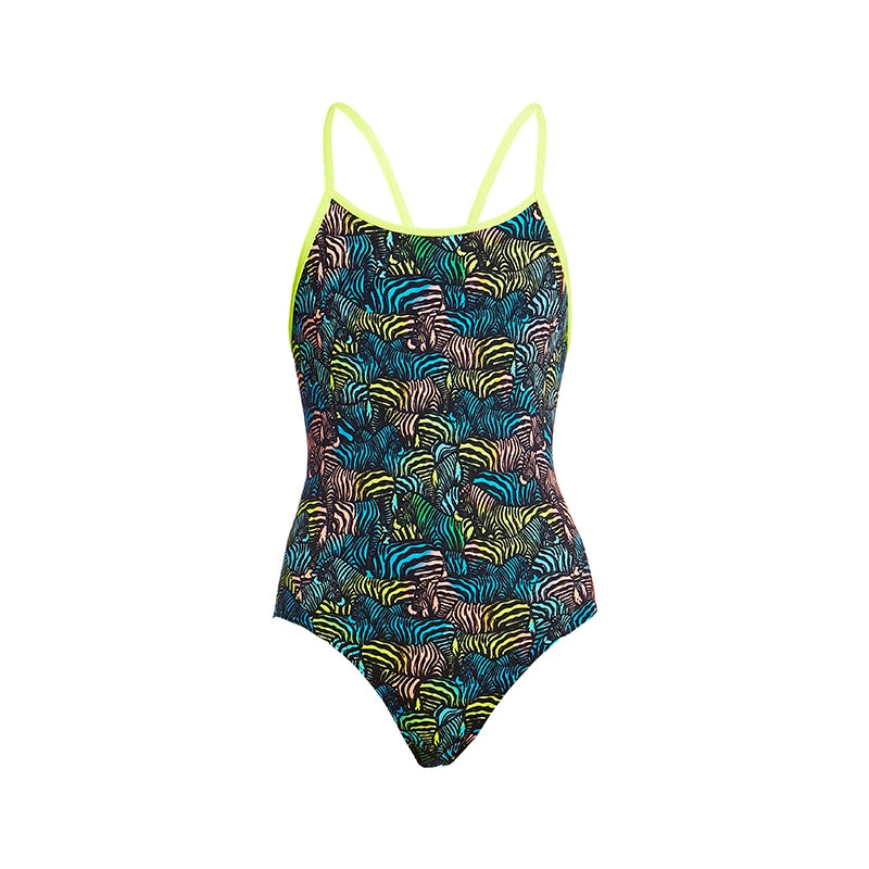 Our classic training style with signature diamond back strap finish and modest rear coverage is perfect for lap sessions. Features a circular cut-out back. With front lining and Funkita embroidery, this easy style says it all.