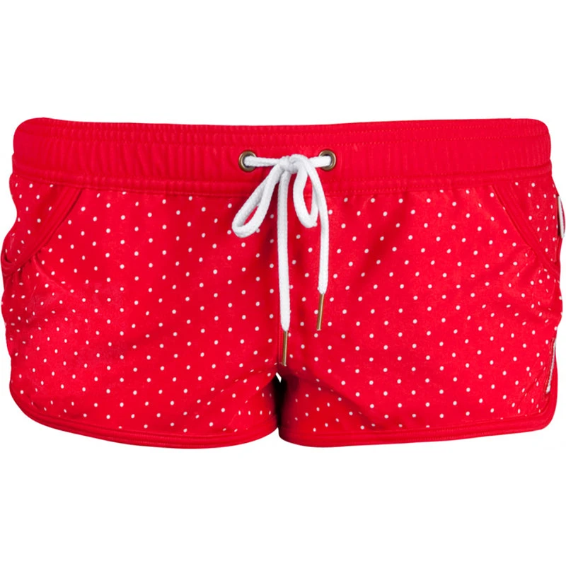 Loose fitting cropped pull-on beach short with shirred waist, side pockets and draw cord to fasten.