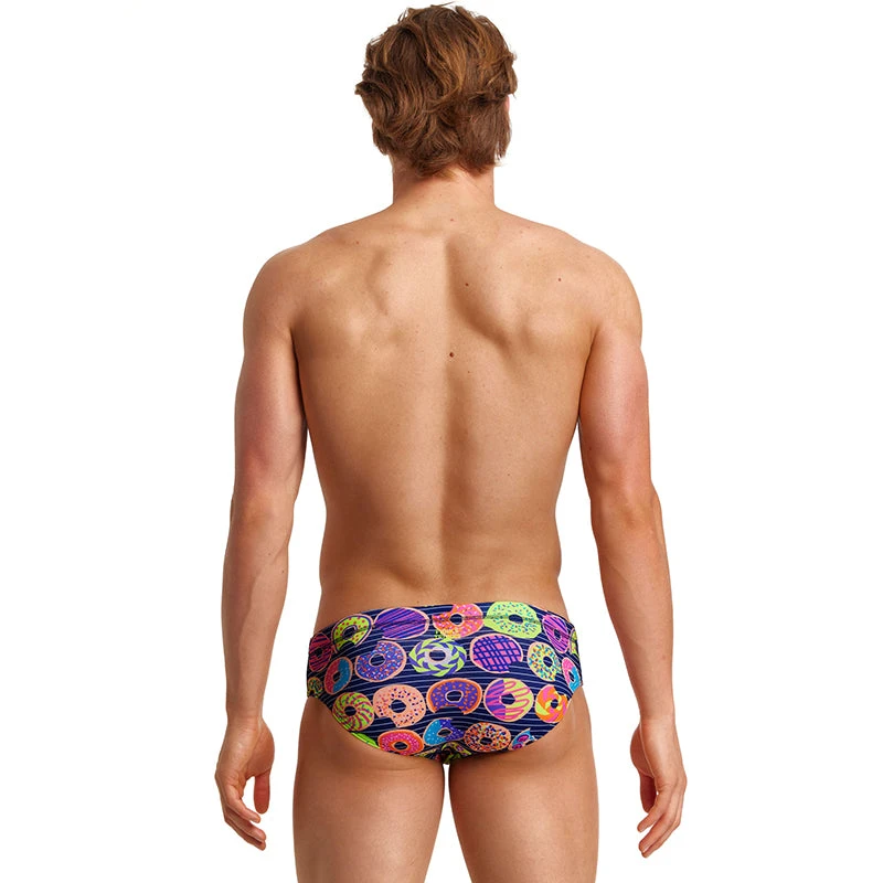 A classic cut brief with 8cm sides and flat elastic waistband and flatlock stitch finish. Drawcord, front lining and Funky Trunks embroidery come standard.