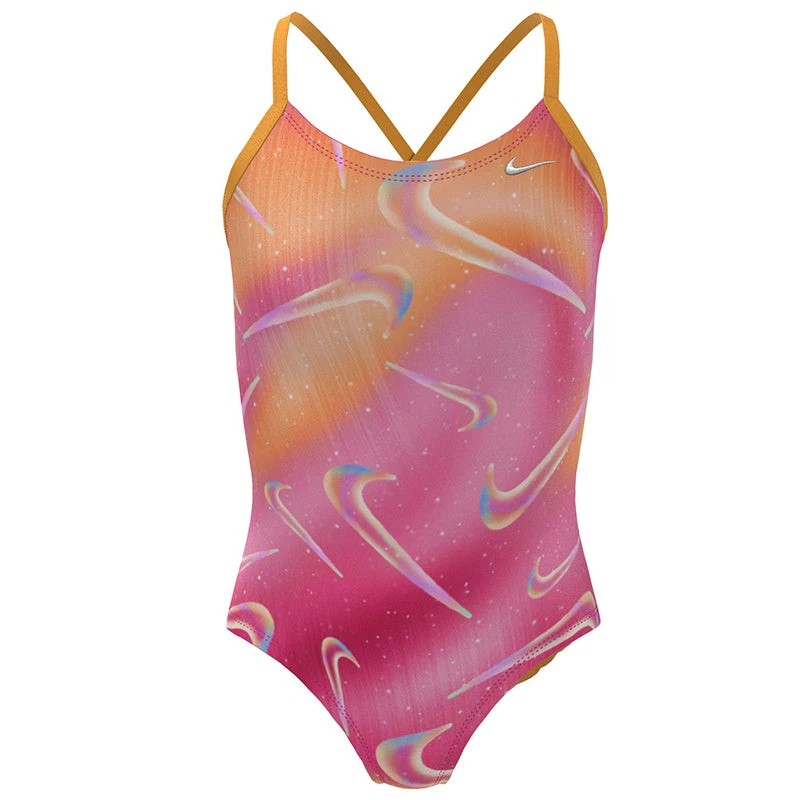 Harness the power of the northern lights in this sporty one piece from Nike. With its colorful space print and ergonomic enhanced fit, this suit is designed with the young athlete in mind. The crossback design for freedom of movement and standard bottom coverage are great on the beach or at the swim meet. Thanks to soft tricot fabrication, this is athletic swimwear that’s comfortable enough for long days of training and competition. (NESSD763)
