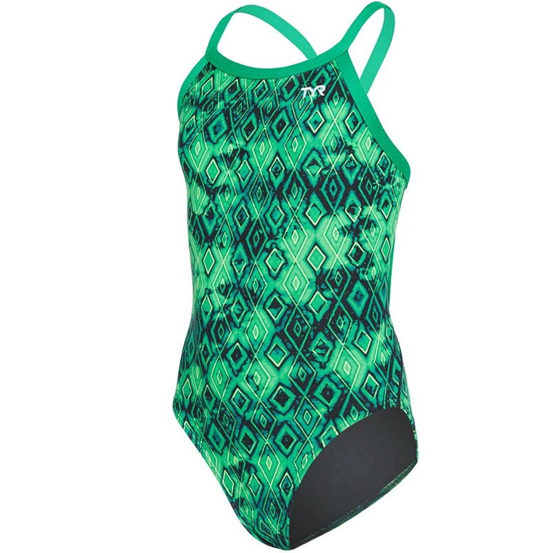Constructed with TYR’s most durable textile, Durafast Elite – the DGLI7A performance swimsuit utilizes high denier poly fiber and innovative circular knit construction to combine the strength and colorfastness of polyester with the comfort of spandex. Featuring a medium neckline, sleek/flexible straps, keyhole back, moderate cut leg and graphic print, the Diamondfit is ideal for athletes who want reliable coverage during every swim.