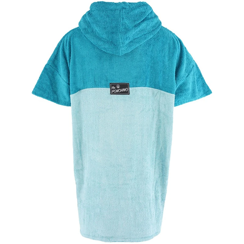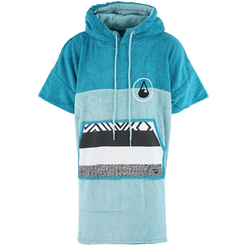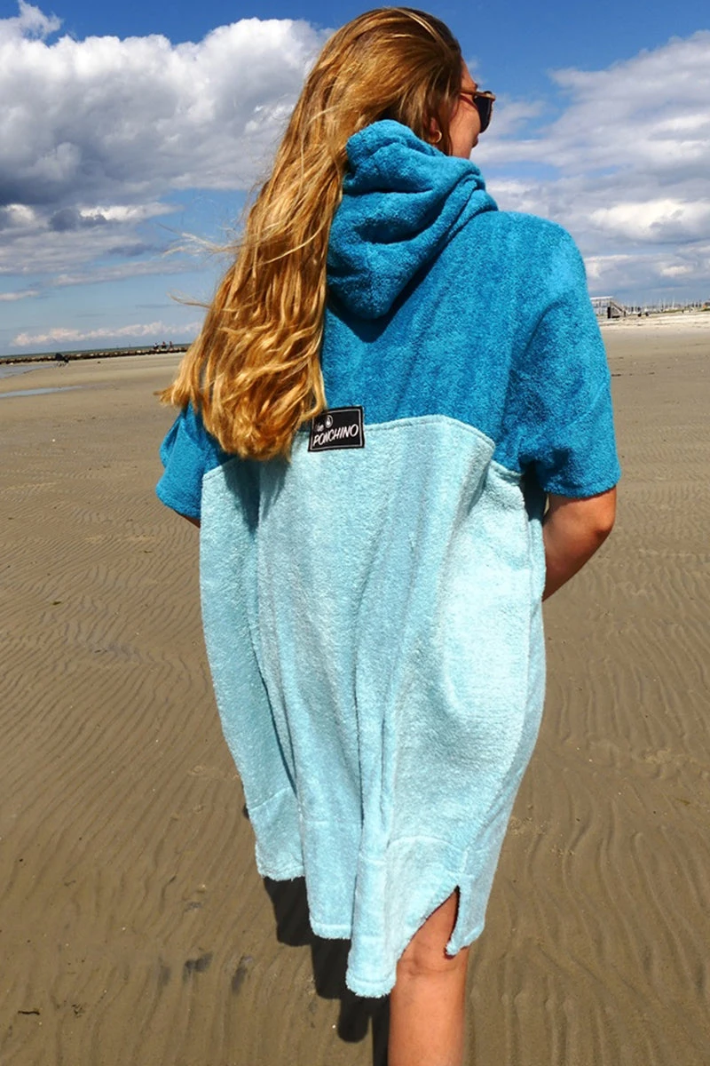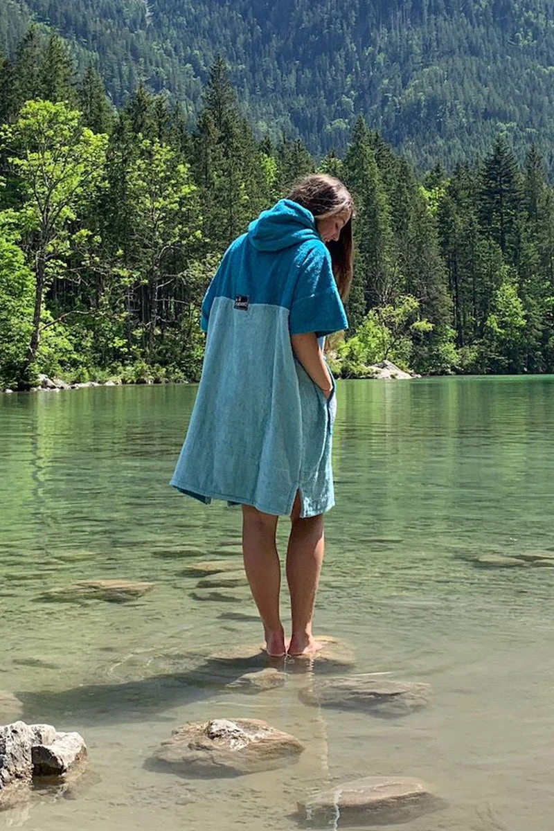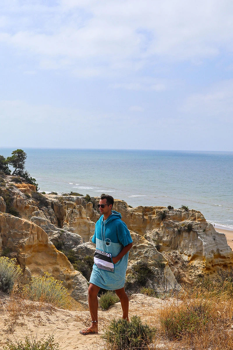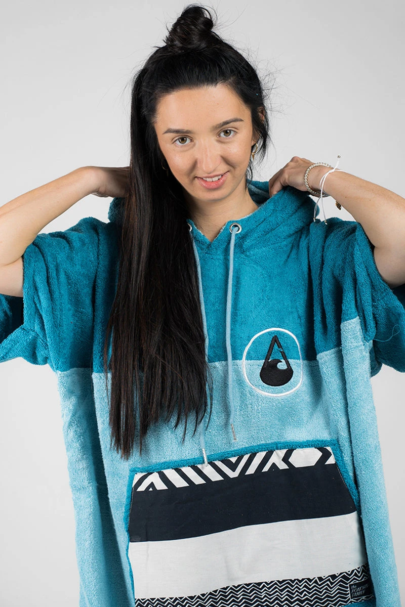 Like all of our ponchos the Air poncho is very comfortable and really celebrates the ocean with its aquamarine and blue colour scheme and patterned black and white cotton pocket panel. The Air comes in size M and is made of 60% Bamboo and 40% cotton (certified Oeko-Tex Standard 100) and although a M size it is easily big enough to pull over a wetsuit. The carefully selected fabrics are particularly cozy and kind to your skin and are also very functional. This poncho has a particularly warm, twin-layer, colour-contrasting hood with a high collar and pull cord threaded through metal eyelets. The large front pocket offers plenty space for carrying your bits and bobs and is especially great for warming your hands on those chilly days on the beach.