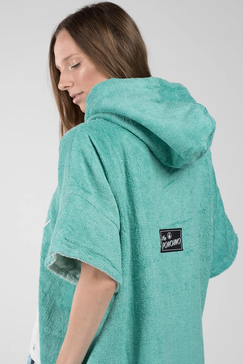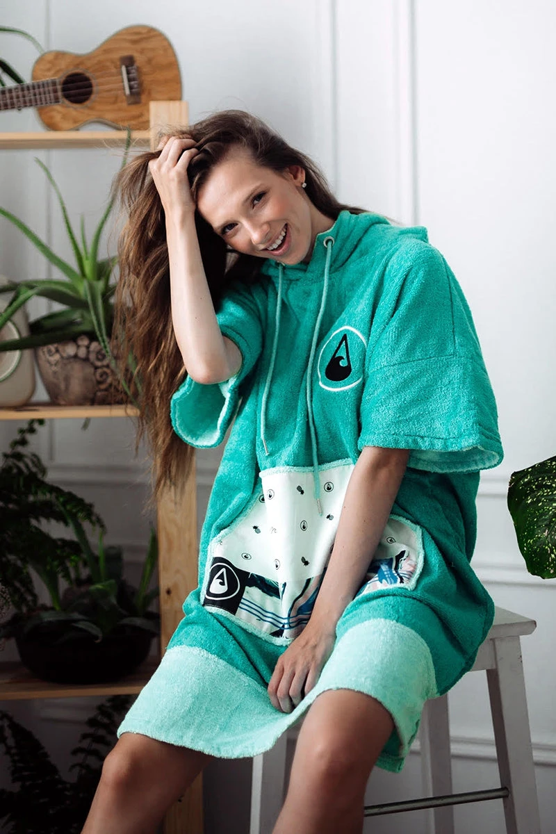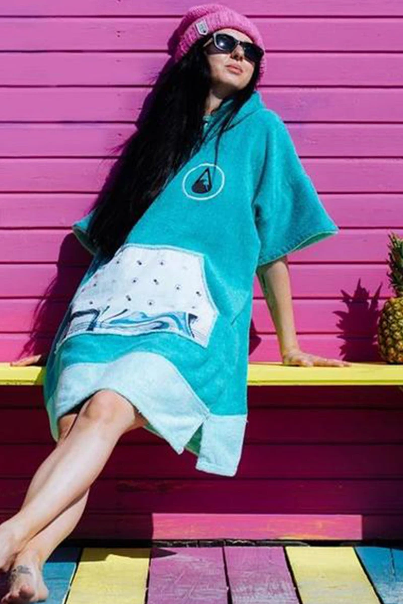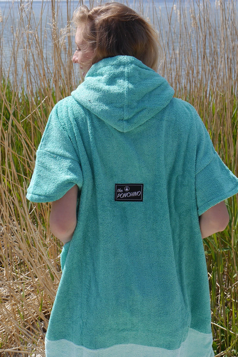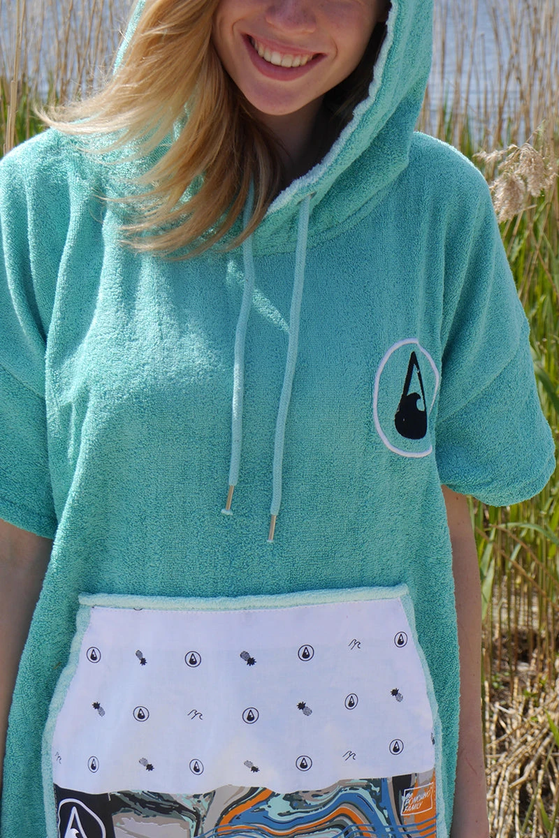 Our Liz poncho is incredibly comfortable and really celebrates the ocean with its aquamarine colour scheme and patterned soft cotton pocket panel. The Liz comes in size S and is made of 60% Bamboo and 40% cotton (certified Oeko-Tex Standard 100) and although a S size it is easily big enough to pull over a wetsuit. The carefully selected fabrics are particularly cozy and kind to your skin and are also very functional. This poncho has a particularly warm, twin-layer, colour-contrasting hood with a high collar and pull cord threaded through metal eyelets. The large front pocket offers plenty space for carrying your stuff and is especially great for warming your hands on those chilly days on the beach! Â